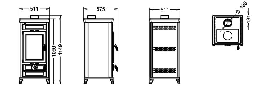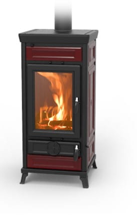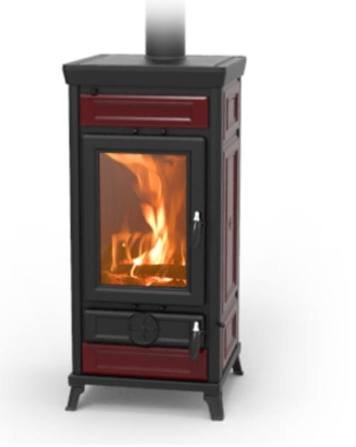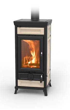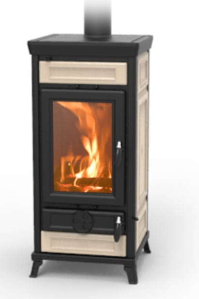 Nowoczesny piecyk powietrzny na drewno jest przeznaczony do ogrzewania pomieszczenia dzięki emisji ciepła po przez swoją obudowę oraz szybę. Piecyk na drewno idealnie sprawdzi się jako dodatkowe źródło ciepła, zapewniając widok żywego ognia. Kominki wolnostojące, opalane drewnem dzięki swoim wymiarom oraz różnorodnej stylistyce idealnie wpasowują się do wystroju każdego wnętrza. Obudowa piecyka wykonana jest z wysokiej jakości żeliwa w kolorze czarnym. Dodatkowo piecyk posiada wstawki ceramiczne Maiolica.